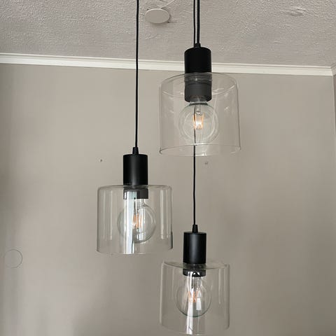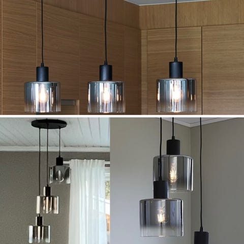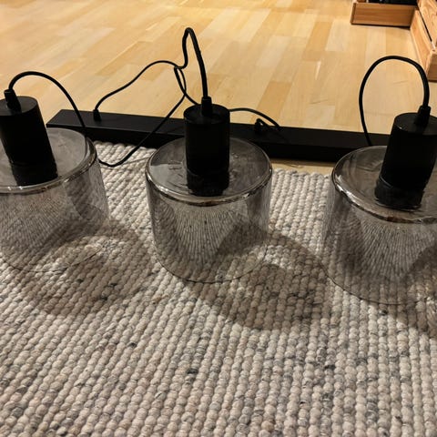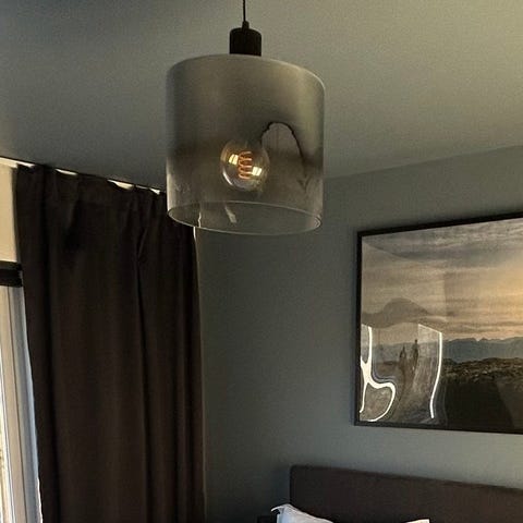 Pent brukt takpendel i røykfarget glass som fader over i klart glass. Kuppelen er 15 cm i diameter. Selges 800 kr,- Kjøpt hos Lampehuset .Selges med pære.