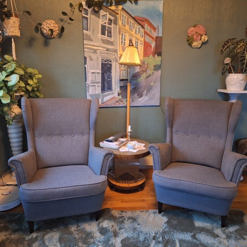 Ganske liten, veldig sjarmerende lenestol. God gyngefjær, perfekt til ammestol på barnerommet.