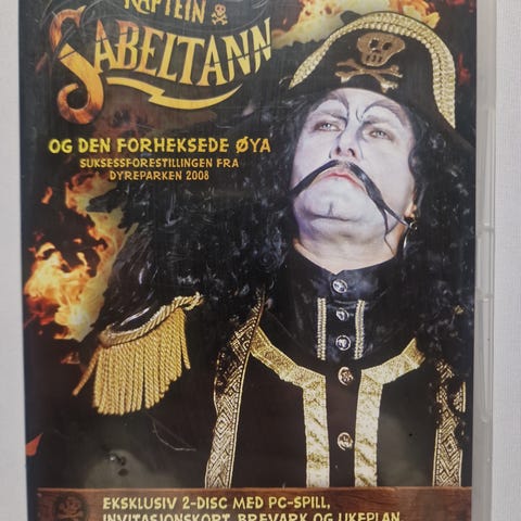 Kaptein Sabeltann PC Spill med pirattema. Spilldisken og omslaget vises, inkludert bakside med beskrivelse og bilder fra spillet. Passer for bruk på PC.