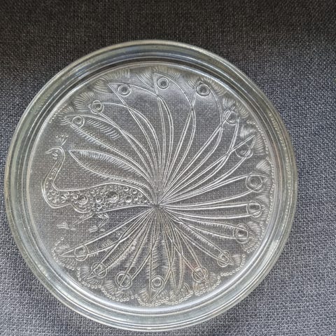 Serveringsfat i glass fra Pukeberg Sweden med kumotiv på.