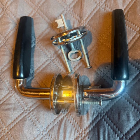 Komplett dørhåndtak med splint, skilt og skruer. Noe slitasje og maling/lakk-rester forekommer. Se bilder.