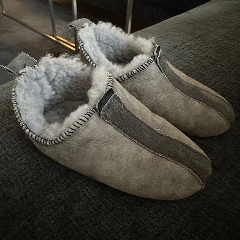 Gode og varme saueskinnstøfler som bare har vært prøvd på. Selges fordi de har blitt stående ubrukt og nå er for små.