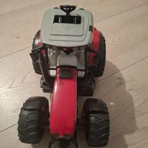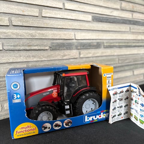 Bruder traktor leketøysmodell i rød farge. Modellen har detaljer som store hjul og førerhus. Egnet som leketøy for barn.