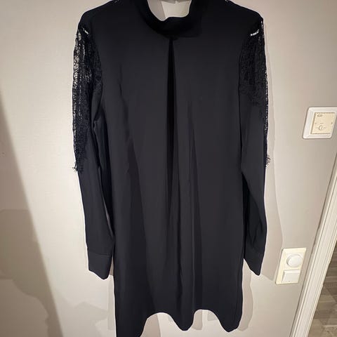 laget av et polyester satengstoff, et tungt og oppgradert stoff med en silkeaktig overflate og et vakkert fall. Den har høy hals, lange ermer med puffermer, høye mansjetter, knappelukking, og detaljer som knapper og en linje ved midjen. Denne kjolen har en normal passform.
