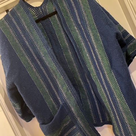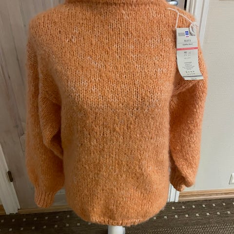 Håndstrikket genser med fadet stripeeffekt i hvitt og forskjellige blå/turkise toner strikket med 3 tråder; en blanding av alpakka, ull, kasjmir og litt syntetisk. Nederkanten og mansjettene er strikket med et supermykt effektgarn/pelsgarn.