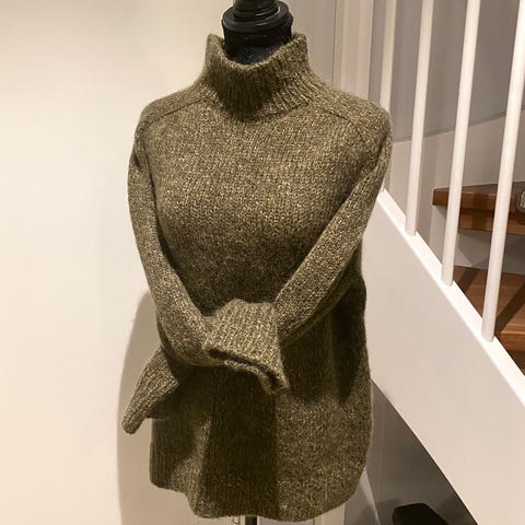 1) Helt ubrukt og nystrikket Sola Sweater fra Le Knit selges rimelig pga plassmangel. Farge: Mosegrønn/kapers (dobbel tråd). Strikket i det eksklusive garnet Rauma Puno Petit og Sandnes Tynn Silk Mohair, og er helt nydelig på, myk og god, og svært luftig og lett (veldig elastisk). Passer både S, M og L, alt ettersom hvordan man vil ha den. Garnpris er rundt 1500 kr. Overvidde: 112 cm. Lengde (uten halsen målt bak): 65 cm. Selges: 790,-.