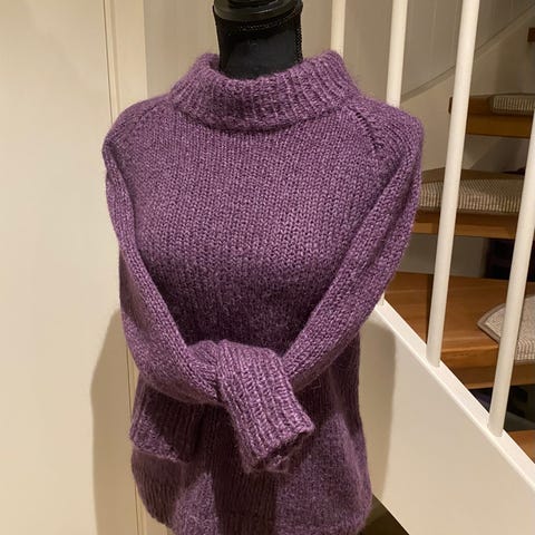 4) Helt ubrukt og nystrikket «Enkel genser» selges rimelig pga plassmangel. Nydelig lillafarge (dobbel tråd). Strikket i det eksklusive garnet Rauma Puno Petit og Sandnes Tynn Silk Mohair, og er helt nydelig på, myk og god, og svært luftig og lett. Passer XS og S (og liten M). Overvidde: 93 cm. Lengde (uten halsen målt bak): 57 cm. Selges: 490,-.