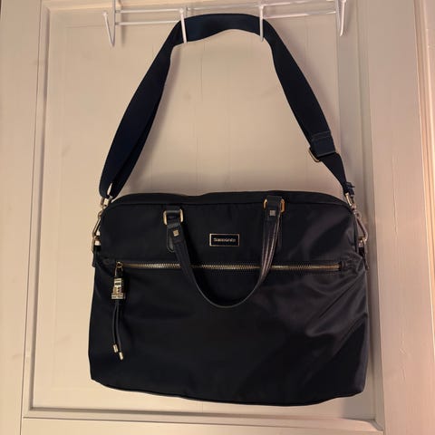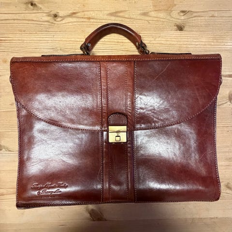 Dokumentmappe laget av lærmateriale. Mappen har flere lommer og rom for organisering, inkludert plastlommer for dokumenter, pennholder og glidelåslomme. Egnet for oppbevaring av dokumenter og annet tilbehør.