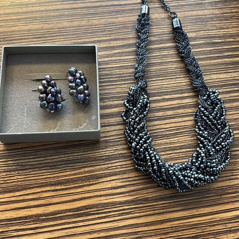Håndlaget langt smykke med et hvitt og gråstripete steinanheng festet til en svart snor. Smykket har et naturlig og enkelt design, egnet for daglig bruk.