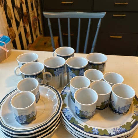 Dette settet ser helt nytt ut, bare en kopp har fått en liten skade. Dette settet er kjøpt for ca 25 år siden.