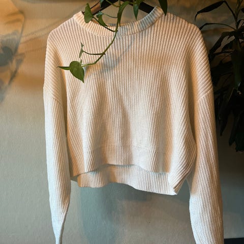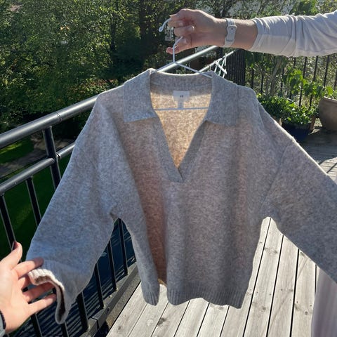 Myk og god angoragenser med båthals. Pent snitt. Halsen kan brukes opp og ned. Lite brukt. Str 36/38 (S/M)
