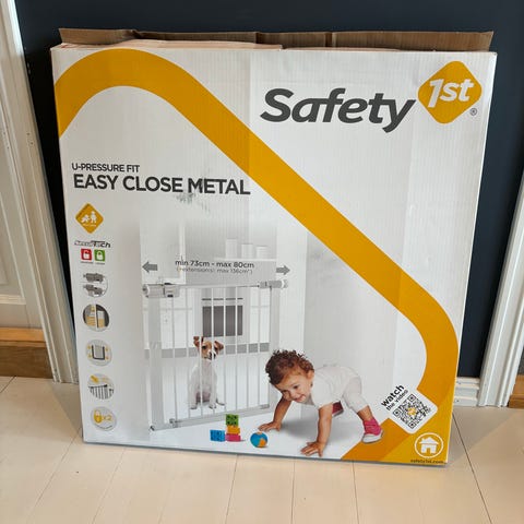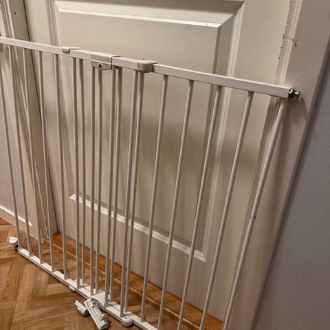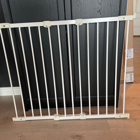 BabyDan trappegrind med forlenger selges. Dette er en spenngrind som monteres uten skruer. Fremstår pent brukt.