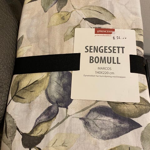 Lyst sengesett i bomull. Merke: Carmina. Ikke åpnet. Størrelser 140•220 cm og 70•50 cm
