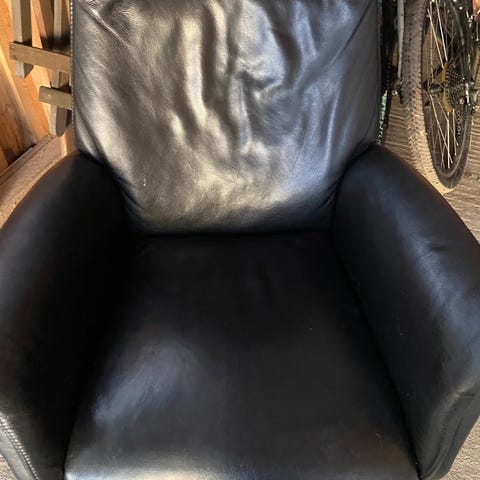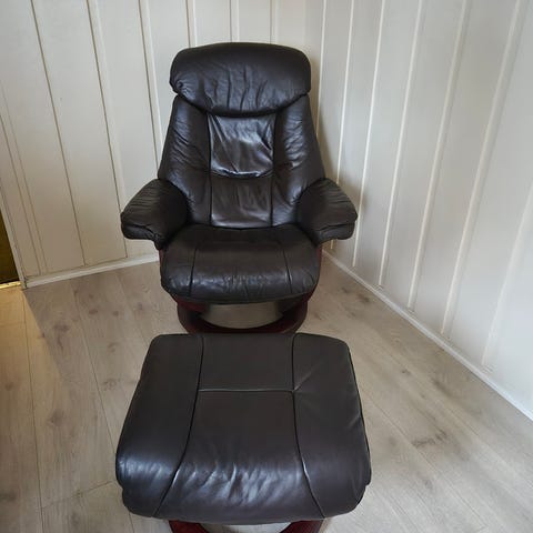 Selger en solid og komfortabel skinnstol med svingunderstell, i stil med/attribuert til Alf Svenssons ‘Form 7’ for DUX. God sittekomfort, høy rygg og hodepute gjør den perfekt til stue, kjellerstue, gaminghjørne eller lesekrok.
