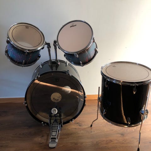Royal star trommesett fra mid 70 Til salgs. Det er montert uoriginal tomholder og basstrommebrakett, men dette er til gjengjeld funksjonellt. Trommene har mange sjelfulle arr etter ett langt liv, men ikke noe som påvirker lyden. Tykke trommer med godt avrundede bærekanter gir mulighet for god gammel vintagelyd. Trommene duger mere en bra nok for gigs. Størrelsene er klassisk omkrets og dybde. Sendes helst ikke.