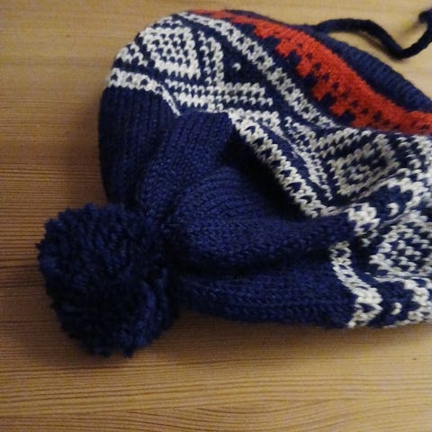 Lite brukt og pent brukt . Passer fra barn til voksen . Fleksibel i str . Ull garn . Klør ikke .
