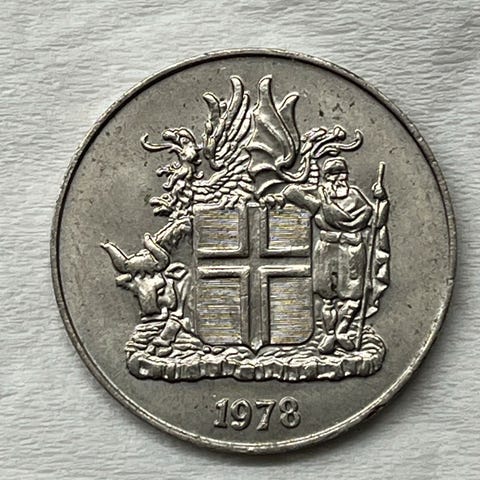 Island 1 Króna mynt fra 1957 med tradisjonelt design og nasjonalt våpenskjold på forsiden. Myntens diameter og materiale er ikke spesifisert.