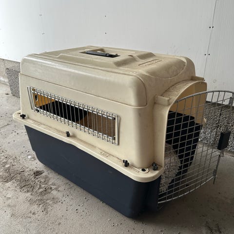 Transportbur for kjæledyr med håndtak på toppen for enkel bæring. Buret har ventilasjonsåpninger på sidene og metallgrind foran. Passer til transport av små til mellomstore kjæledyr.