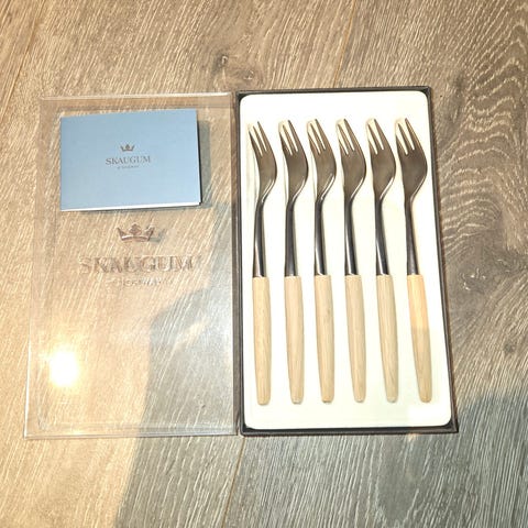 11 kniver, 10 skjeer, 12 gafler, salatbestikk, ostehøvel, kakespade, 5 teskjeer, 4 koldgafler og en annen kniv. Kr 100 per del. Kan sendes mot frakt.