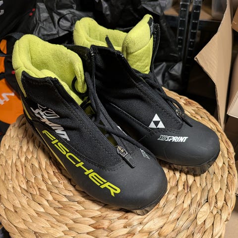 Pent brukte Fischer skisko i str 34 selges for kr 200