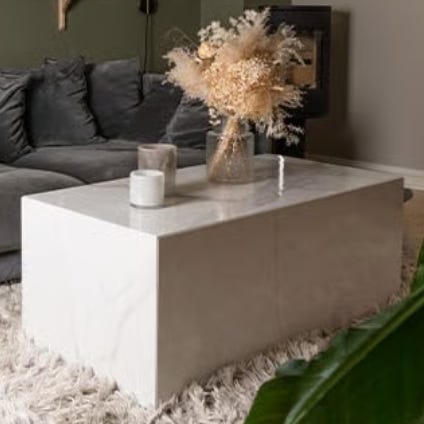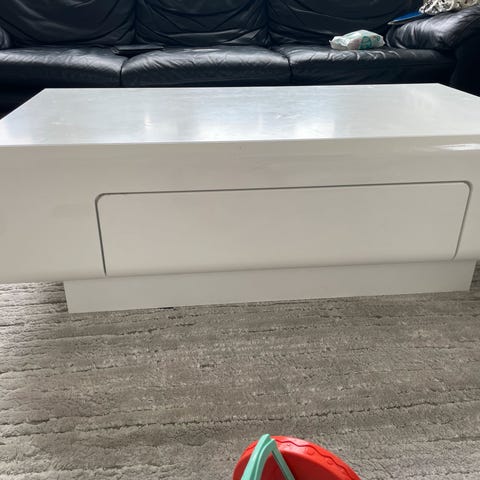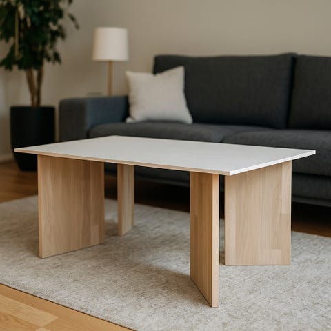 Selger et solid og veldig pent sofabord laget for selv. Det har en hvit plateflis og stabile ben i eik.