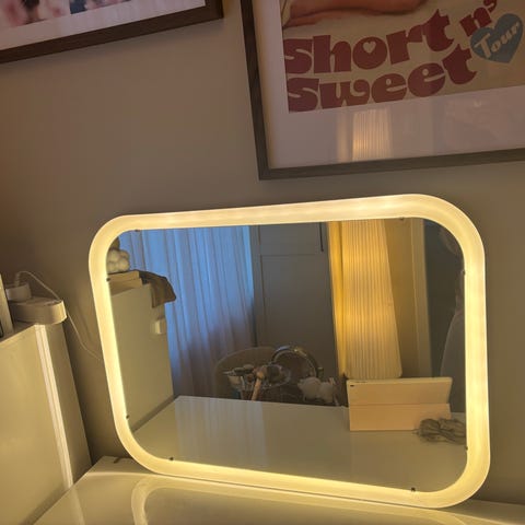 IKEA speil med stativ i hvit farge. Frittstående design med rektangulært speil og metallramme.