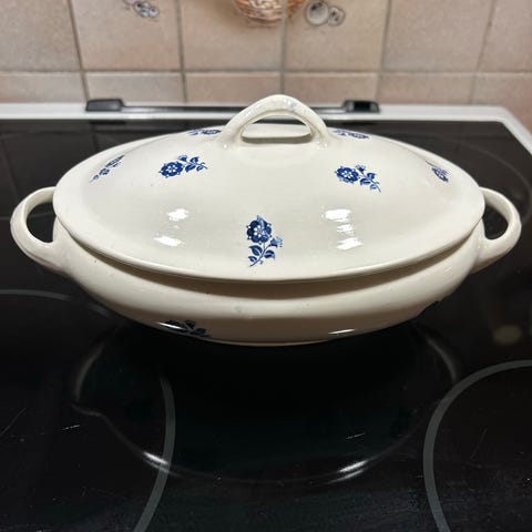 4 store t-kopper med t-fat og asjetter selges. Asjett 21 cm i diameter.