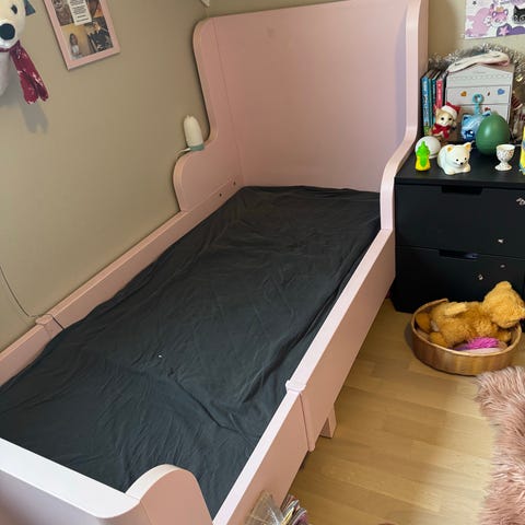 IKEA juniorseng i rosa farge. Passer for barn og har en enkel design tilpasset juniorbruk.