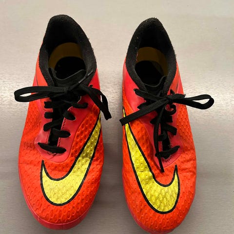 Nike Mercurial fotballsko i fargene rød og svart, størrelse 33,5. Skoene har knotter for bruk på gressbaner.