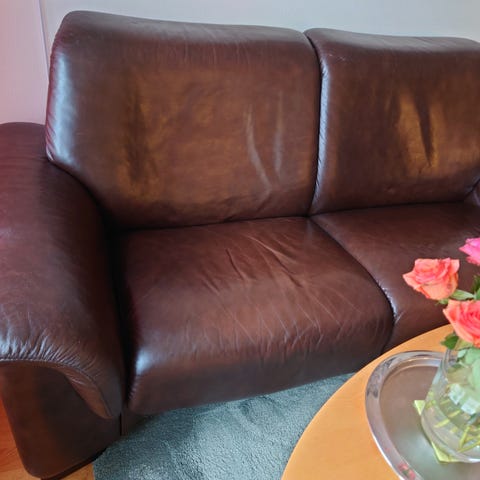 Selger en flott sofagruppe i skinn. Fargen er okseblod, en dyp burgunderrød.
