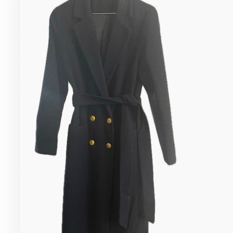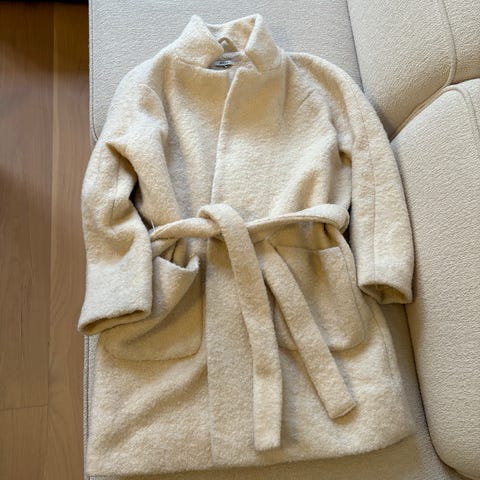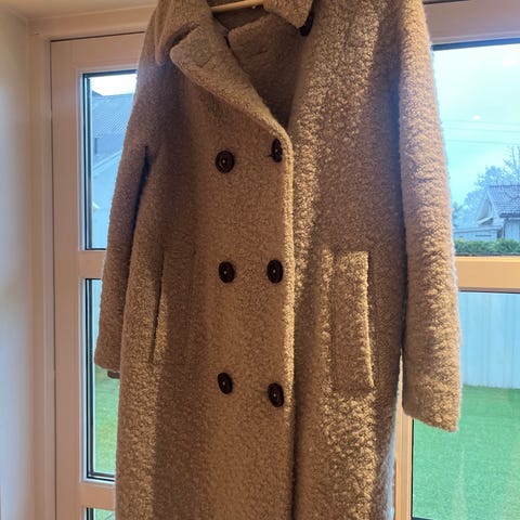 Ganni Annet yttertøy i størrelse XS for kvinner. Jakken er laget av ullmateriale og har en grå farge. Den har belte i midjen og lommer foran. Ene stroppen til beltet er løsnet, men skal være enkelt å sy på igjen.