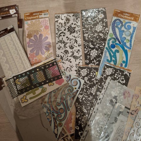 Diverse pynt og materiale til scrapbooking. Uåpnet. Posen med «blomster» er fylt opp og samlet. Det er også bilde av denne fra 2 sider for å vise farger på blomstene. Har flere annonser ute så samsender, pris kan også forhandles ved kjøp av flere annonser. Mulig porto må endres ved samsending