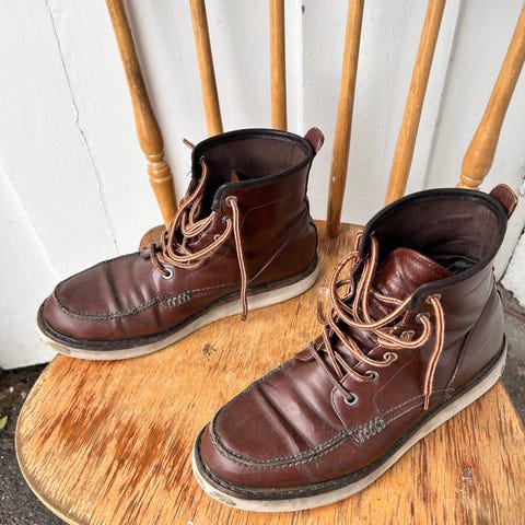 Stilige GANT støvler i størrelse 42, laget av brunt skinn. Støvlene har snøring og en lys såle. Passer for bruk som fritids- eller arbeidssko.