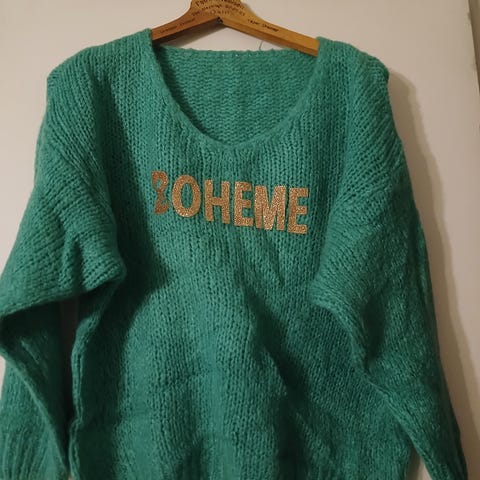 Pen genser med litt puffermer. Den har en fin grønnfarge, litt vanskelig å få frem på bilder.