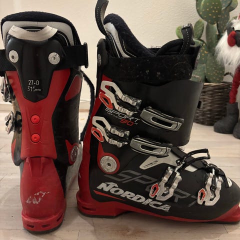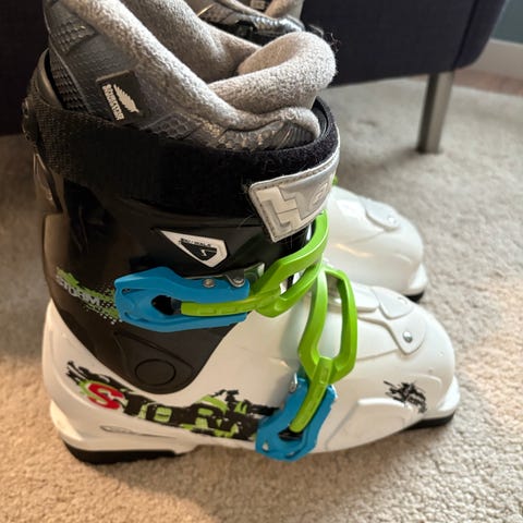 Selger et par slalåmstøvler i mondostørrelse 25 fra Alpina. Datteren min brukte str 38 i vanlige sko da hun brukte disse. Det står str 39 inni, men de er små i størrelsen. Ganske god stand, men en del bruksmerker.