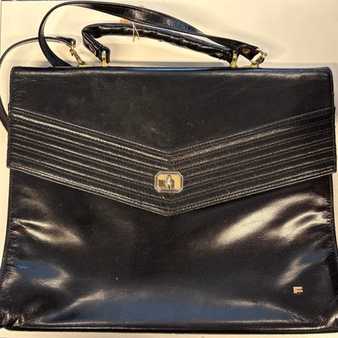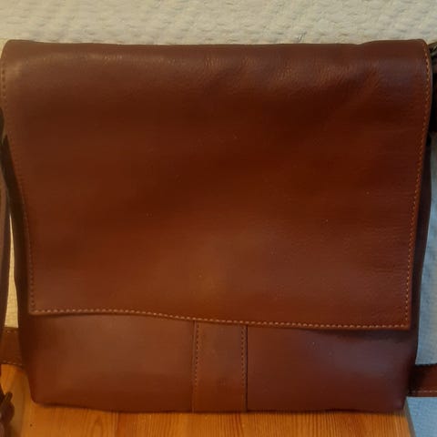 Skinnet har utviklet en nydelig naturlig patina, med lett bruksslitasje som gir karakter, ikke slitasje. Vesken fremstår hel, ren og fullt brukbar, med solide sømmer og fine detaljer i metall. Innsiden er ryddig og praktisk med flere rom, inkludert glidelåslomme for verdisaker.