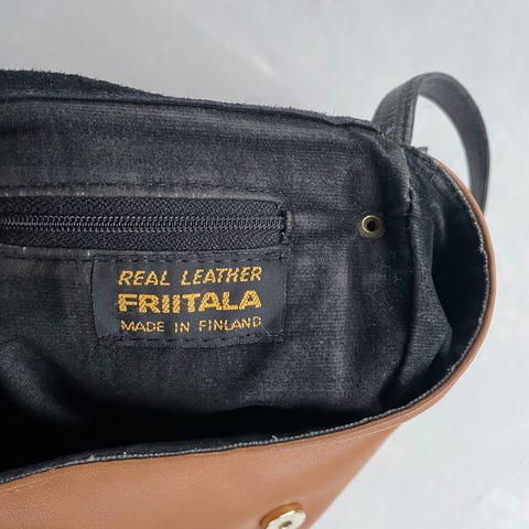 Friitala er kjent for svært høy håndverkskvalitet, og disse finskproduserte veskene er blitt ettertraktet blant både vintage- og designinteresserte. Denne har et uttrykk som fungerer like godt til hverdags som til pent bruk, og kan bæres både som clutch og med skulderreim.