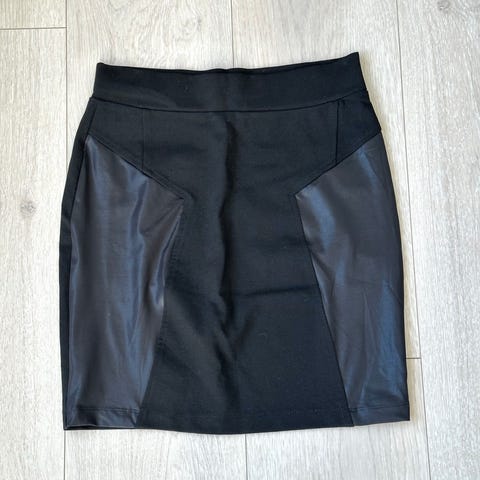 Et miniskjørt i coated kvalitet med frynser i flere rader og midje med flettesøm. Skjult glidelås og hektelukking bak. Ufôret.
