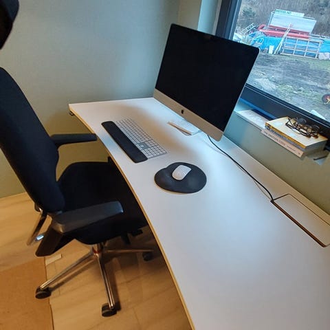 Pulten er 160cm bred, 80cm dyp og høyden kan justeres fra 69-119cm.
