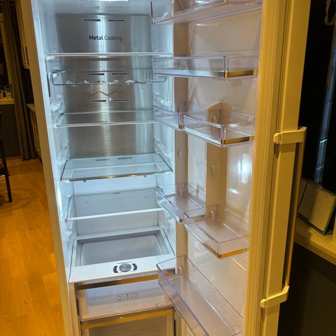 Siemens kjøleskap med rustfritt stål utvendig. Innvendig består av flere hyller og skuffer for oppbevaring av matvarer. Egnet for kjøkkenbruk.