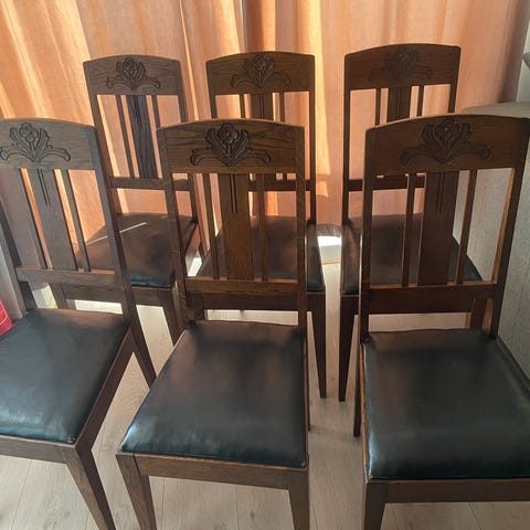 Eldre stoler – forventet slitasje. Det finnes enkelte merker/sprekkdannelser i treverket, og som med mange eldre stoler kan det forekomme behov for enkel stramming/vedlikehold av en eller flere. Selges som de er.