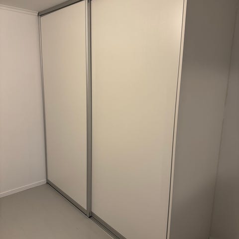 Garderoben består av 3 skap (2 x 75 cm + 1 x 50 cm), samt skyvedørspar og dør.