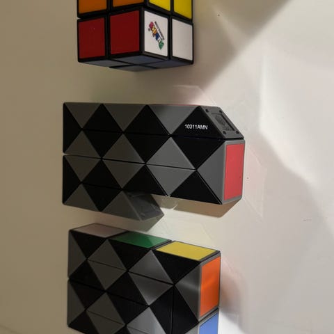 Rubiks kube i tre forskjellige størrelser: 3x3, 2x2 og 3x1.