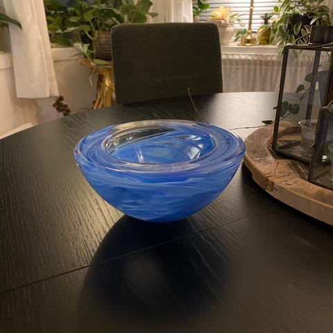 Kosta Boda dekorasjonsskål i glass med hvite, virvlende mønstre. Skålen kan brukes som dekorasjon eller til oppbevaring og servering.