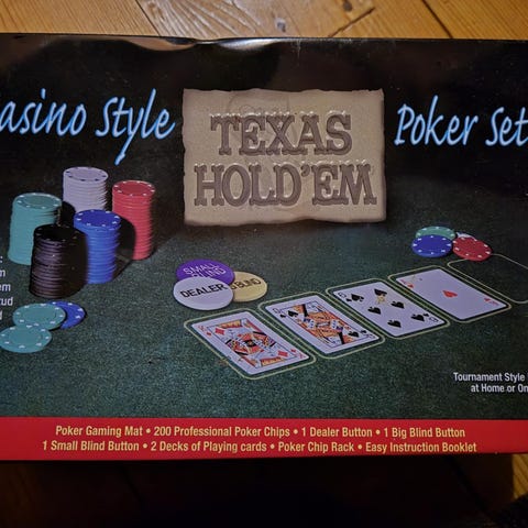 Texas Poker Set med koffert, inneholder 200 stk pokerbrikker. Settet inkluderer også to kortstokker, dealer knapp, og terninger. Kofferten er laget av aluminium med lås for sikker oppbevaring og transport.