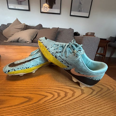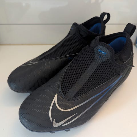 Nike Phantom fotballsko i blå farge. Skoene har knotter for feste på gressbaner og er designet for bruk ved fotballspill.