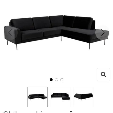 Skeidar hjørnesofa i svart stoff. Sofaen har flere puter og en romslig sitteplass, egnet for stue eller oppholdsrom.