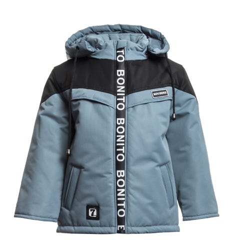 Jakken har glidelås som går opp til høy krage. Glidelåsen skjules av en langsgående stolpe med hvit Bonito logo. Det svarte bærestykket i trekantform dekker skulderlinjen på en stilig måte. Lange isydde ermer med komfortabel passform er praktiske over en tykk genser. Forstykket har innfelte lommer med klaffer. Størrelsen på den varme hetten kan enkelt justeres med snøring. Ytterlaget er laget av vannavstøtende polyester og innsiden er isolert med moderne syntetisk vattering. Jakken er dekorert med stilige fargede merker på forsiden.