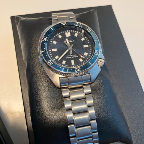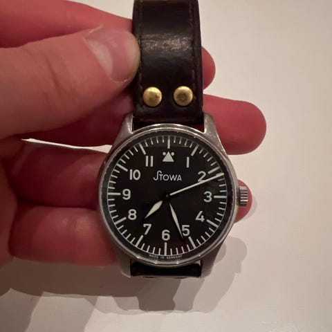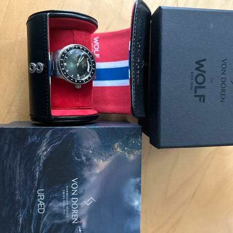 Denne er nesten ikke brukt. Det følger med blå skinnreim og svart gummi reim. Pussekluter og egen boks.