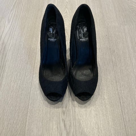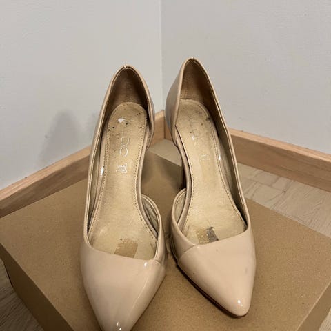ALDO Hæler i størrelse 36 med sort farge. Skoene har en dekorativ perforert design og høye hæler. Materialet ser ut til å være syntetisk med en blank finish på hælen. Passer til formelle anledninger eller bruk som pyntesko.